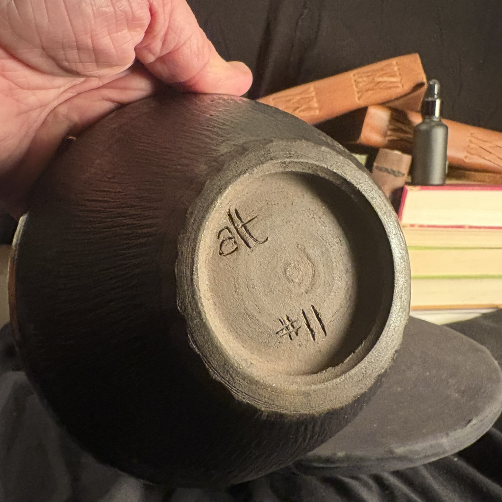 Having let the piece dry out some, it went back on the wheel upside down to scrape off excess from the bottom and carve out a foot. The texture around the perimeter is actually created in the trimming by raising the speed of the wheel, then holding the trimming tool lightly at an oblique angle and letting it vibrate off the surface doing what is called "chatter".
