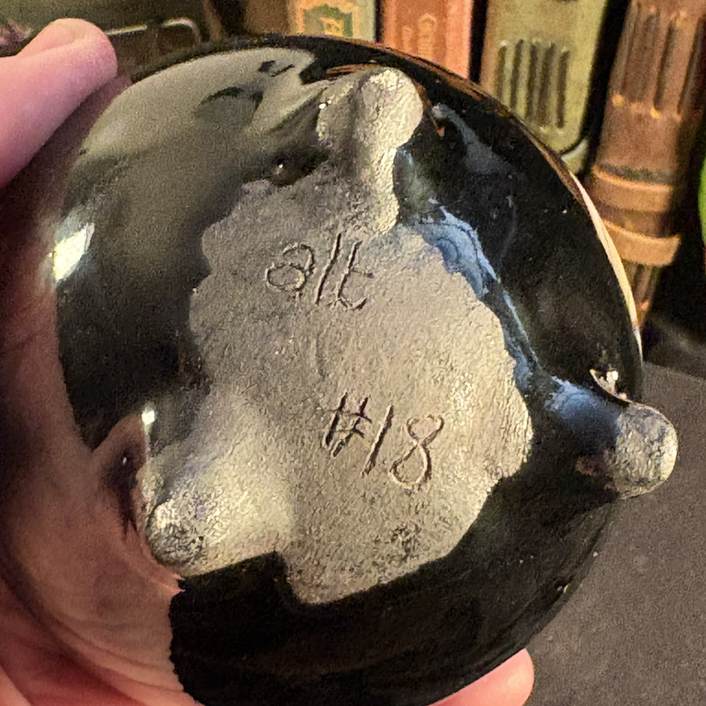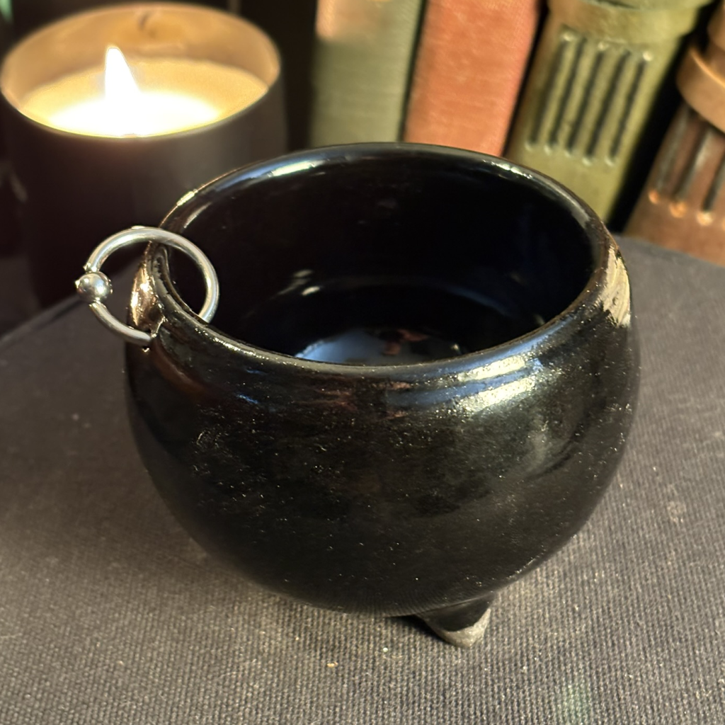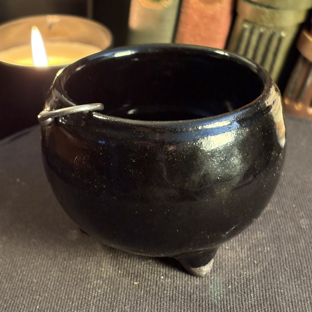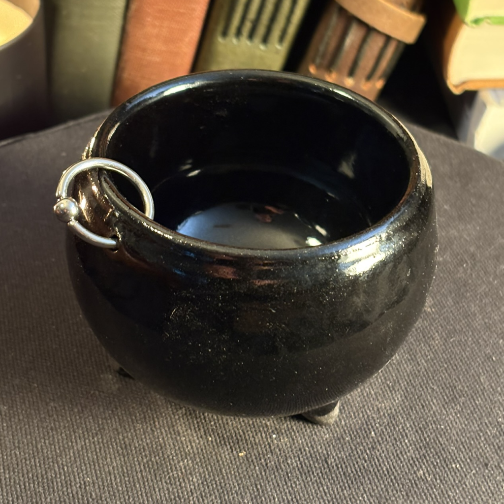 Round cauldron with three petite feet, ridged rim. Glossy black inside and out.
