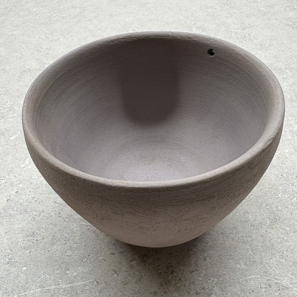 Spun on the wheel to scrape down the thickness somewhat, and carve out a recessed foot.
