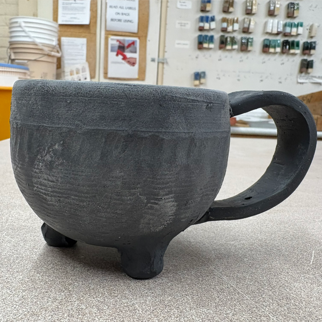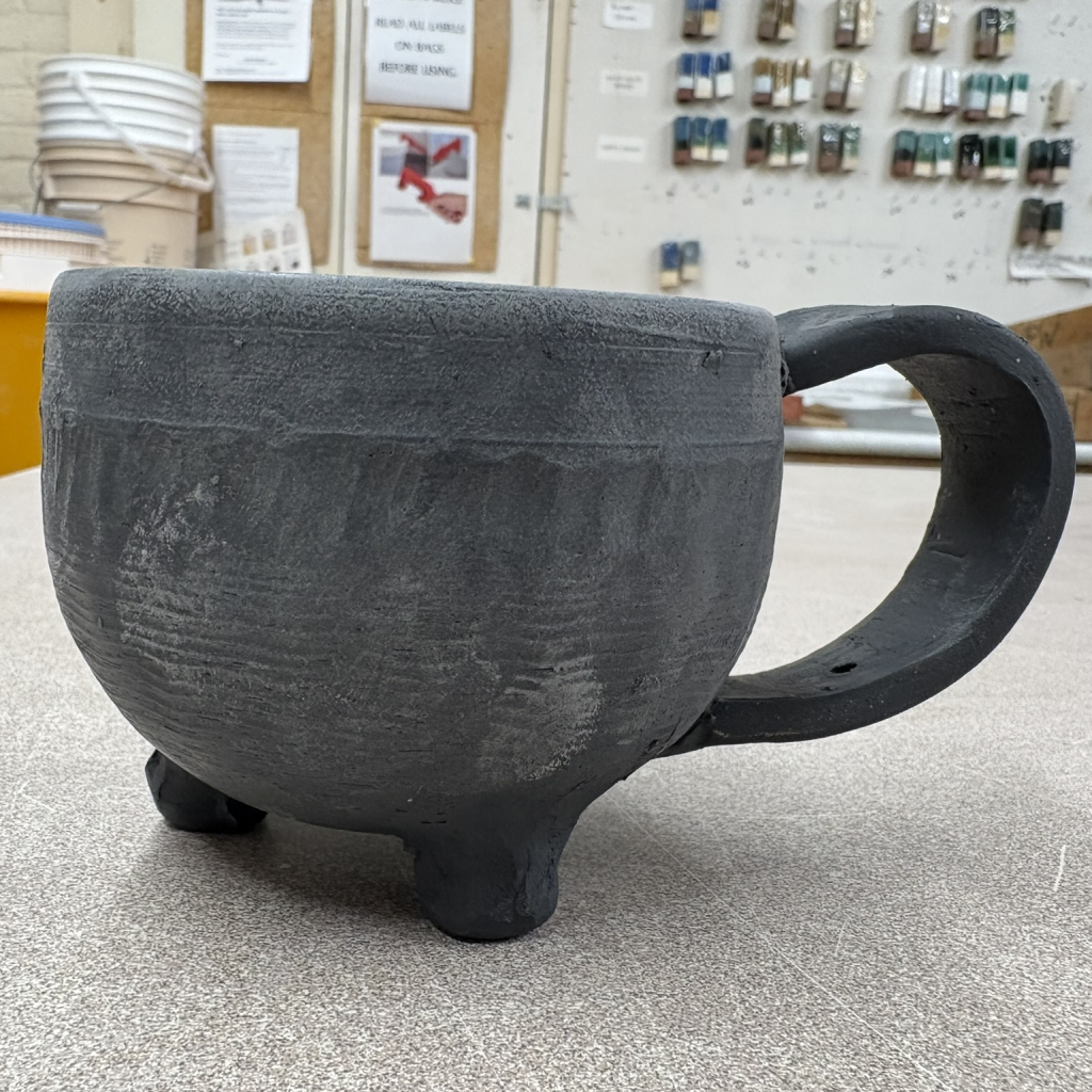 three footed round bottom mug with strap handle, piercing in handle lobe
