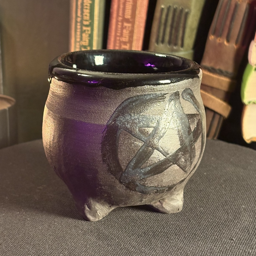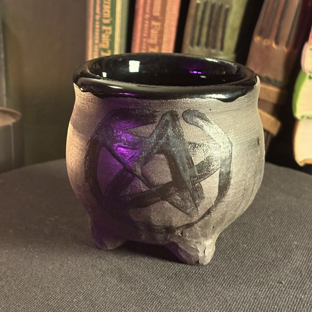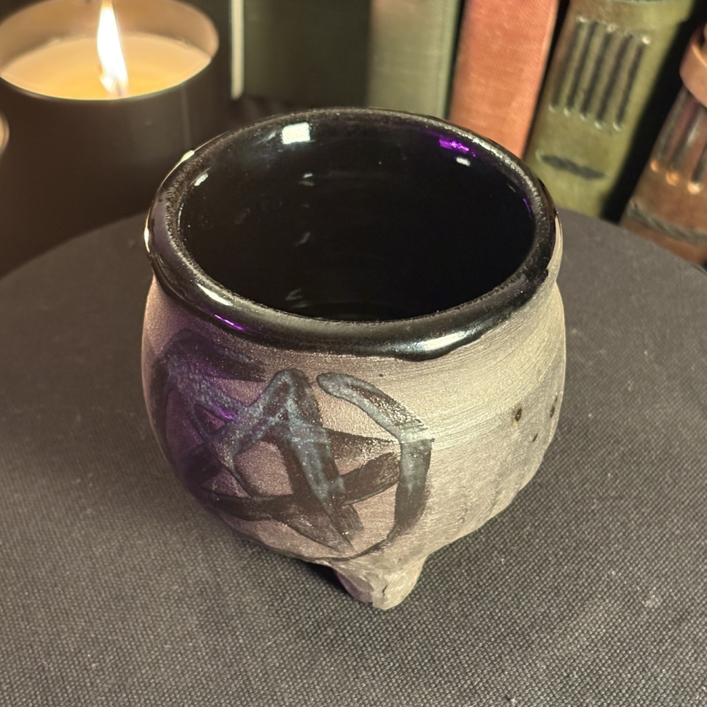 Three footed cauldron. Glossy black inside, raw unfinished clay outside with a freehand brushed pentacle in matte black.