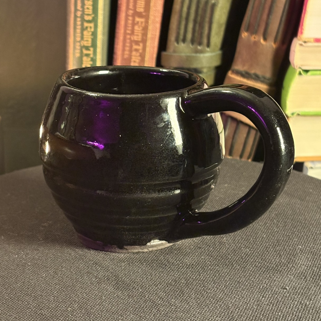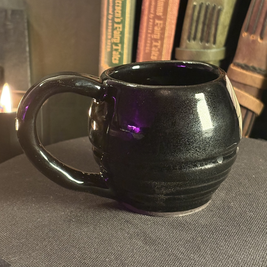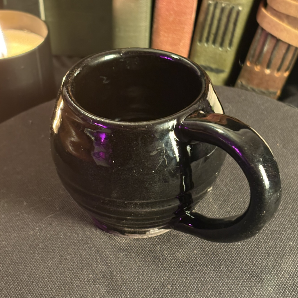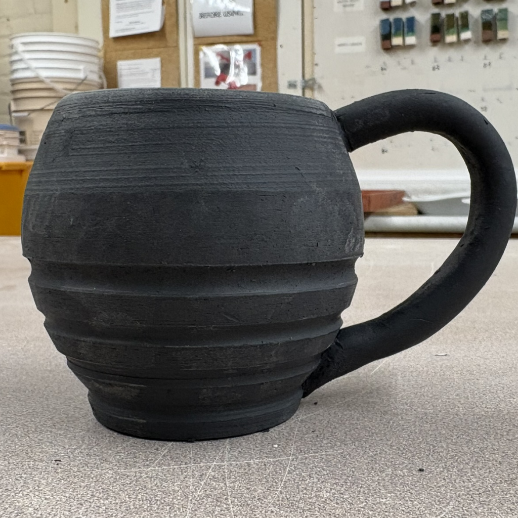 Medium mug with four carved stripes, pulled handle. Glossy black inside and out.