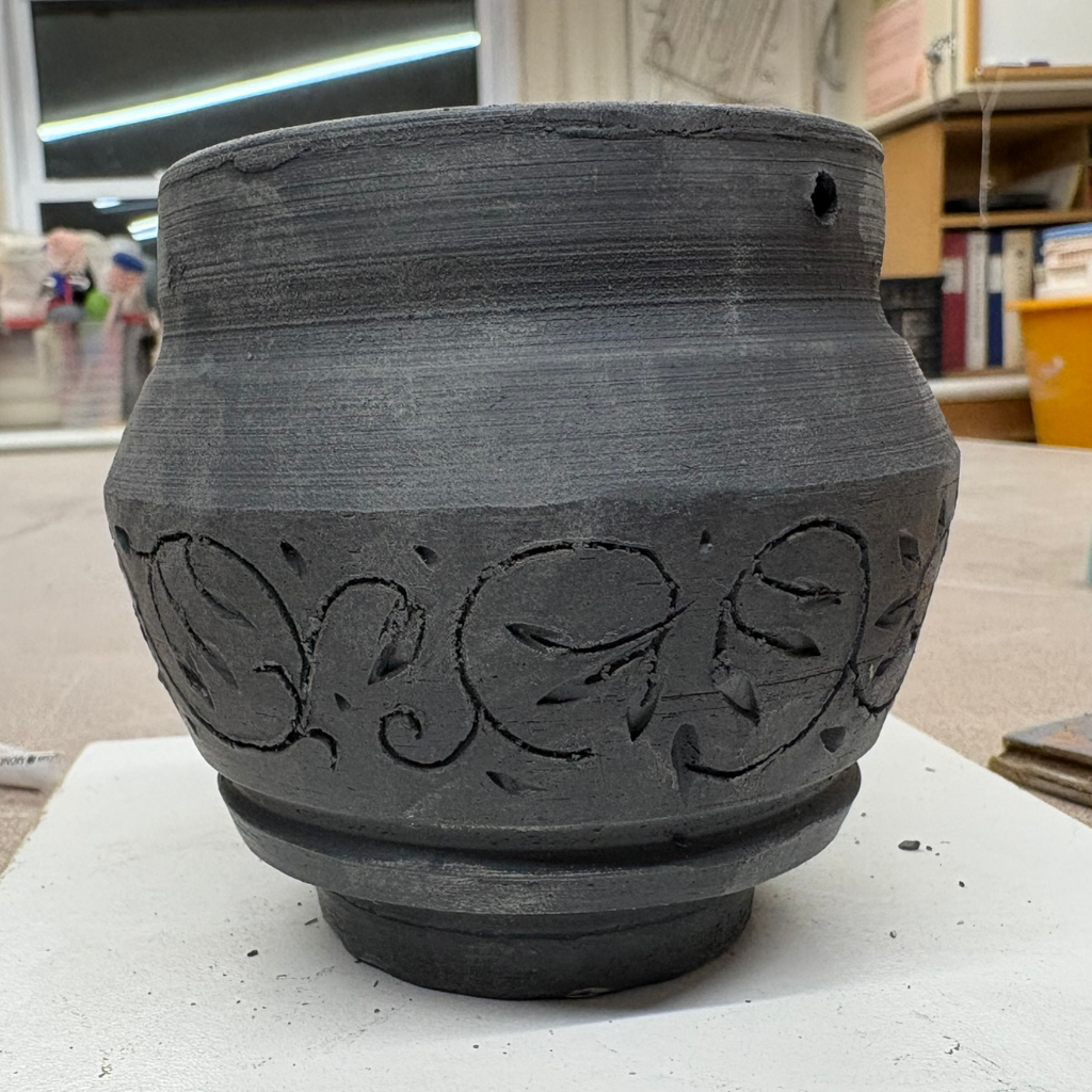small planter with freehand carved design, heavy bottom