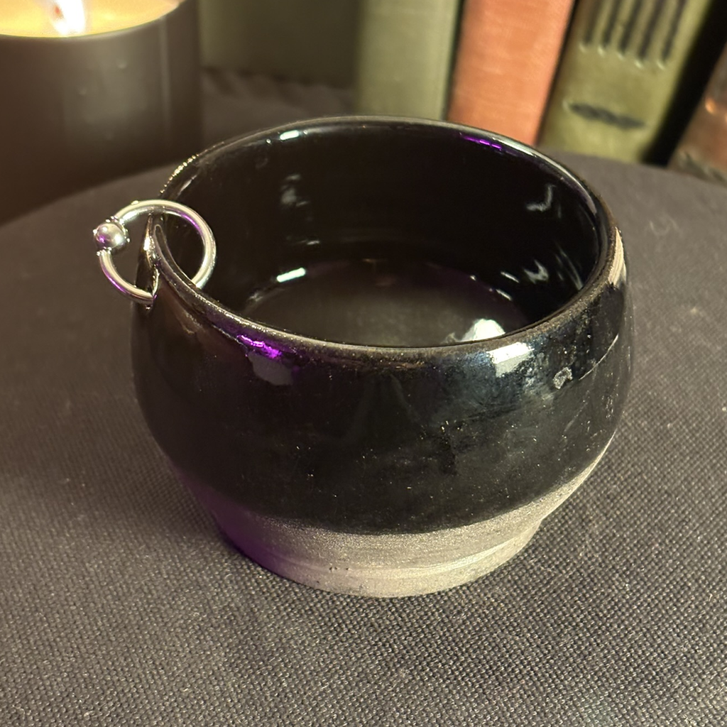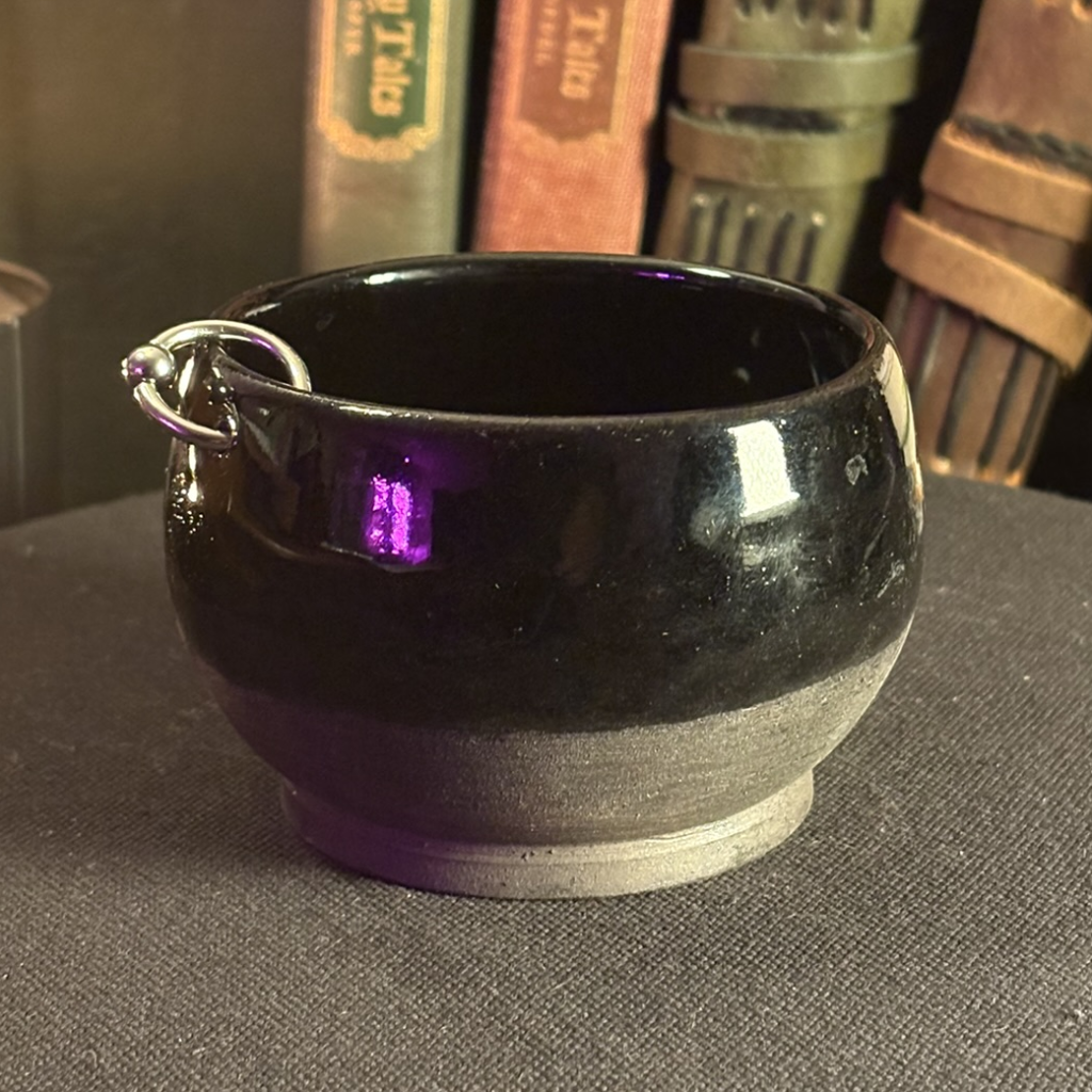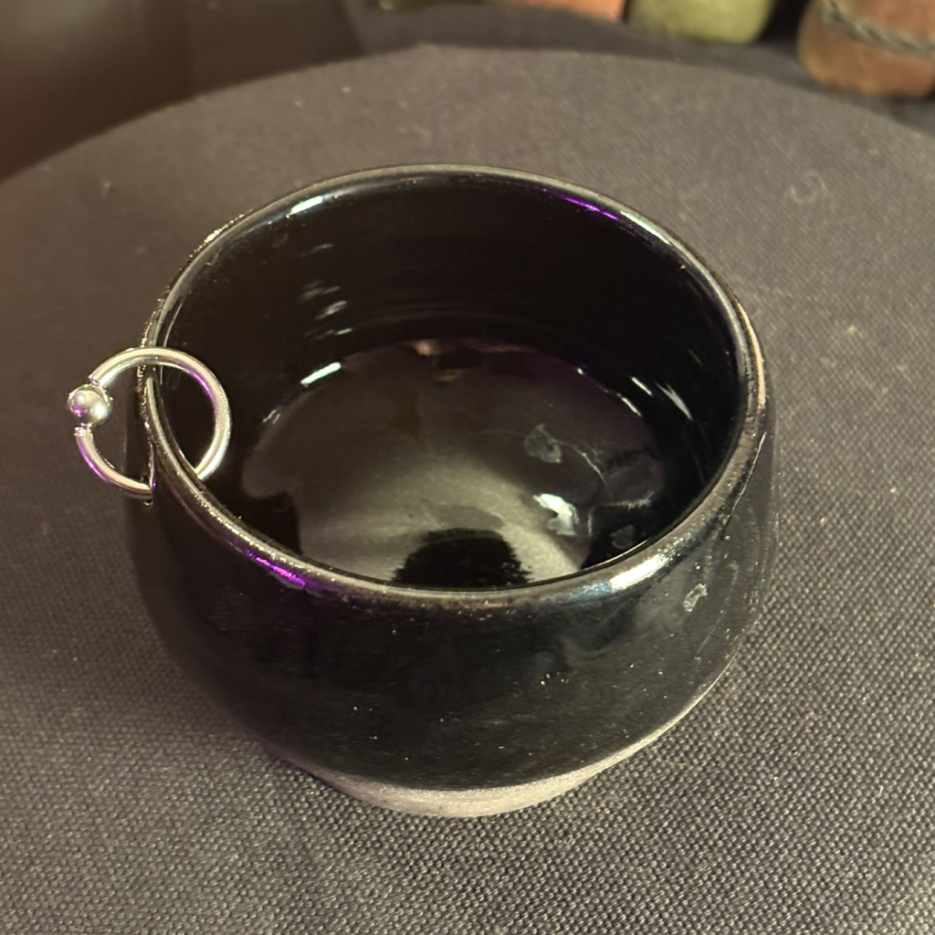 Small simple bowl, dipped half way down. Glossy black inside. Single piercing.