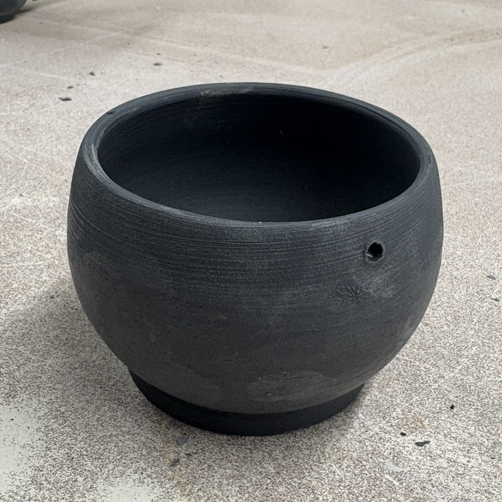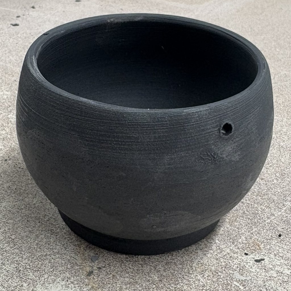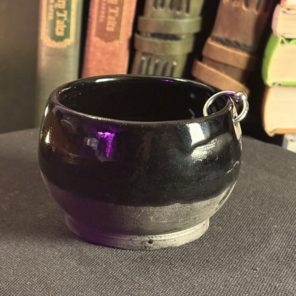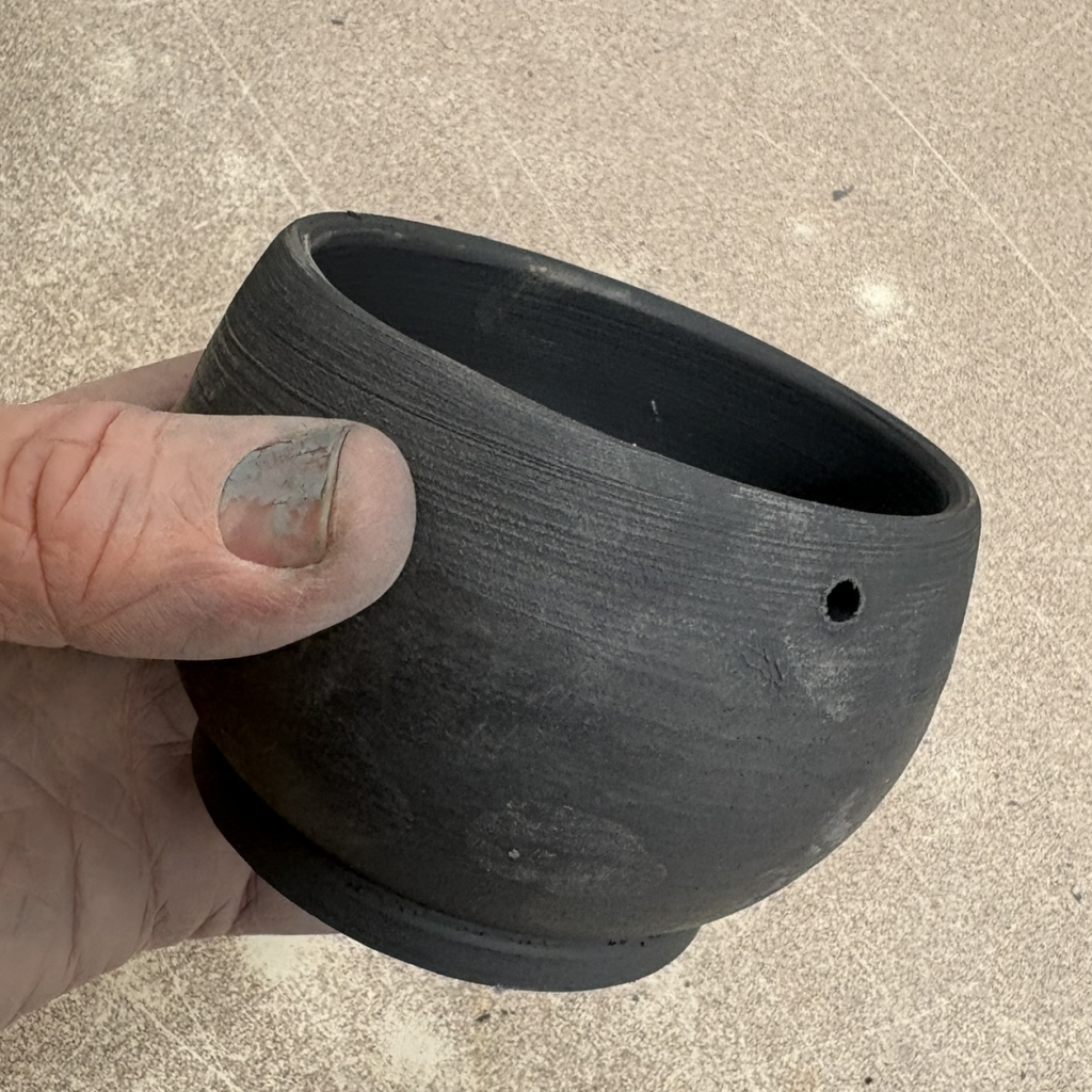 Small simple bowl, dipped half way down. Glossy black inside. Single piercing.