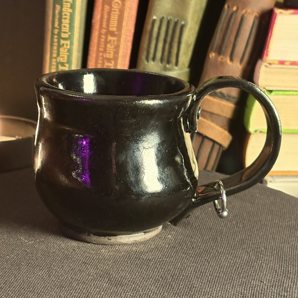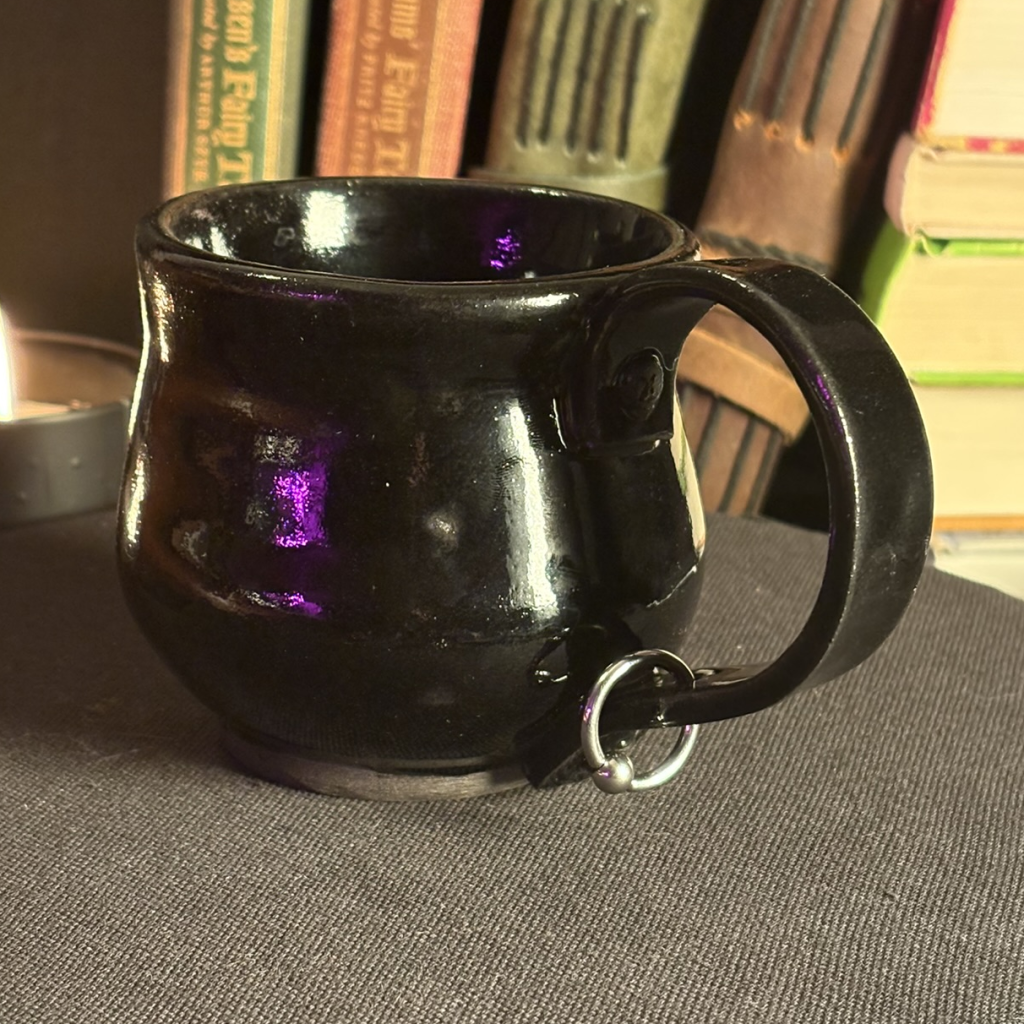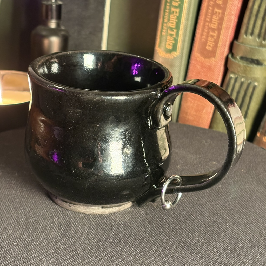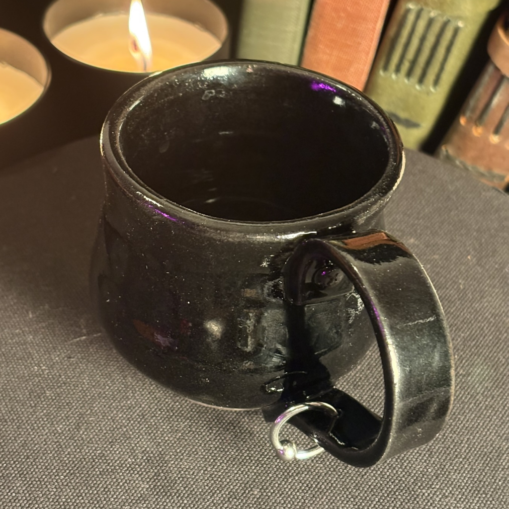 Round-bellied mug with strappy handle, one piercing. Glossy black inside and out.