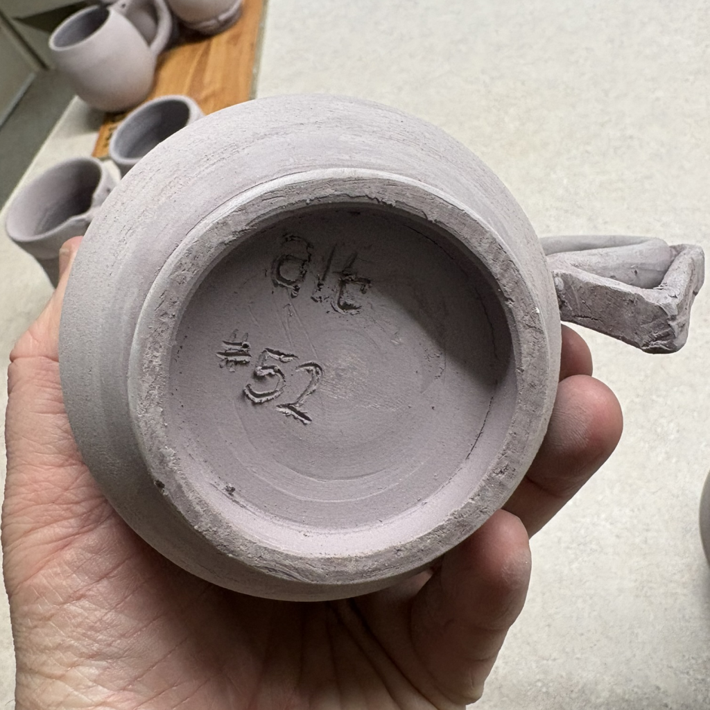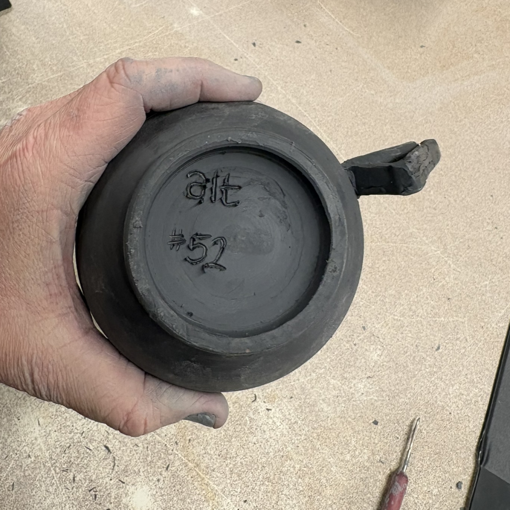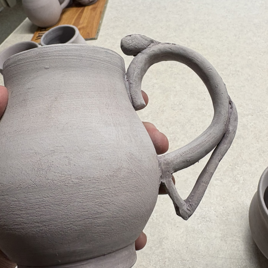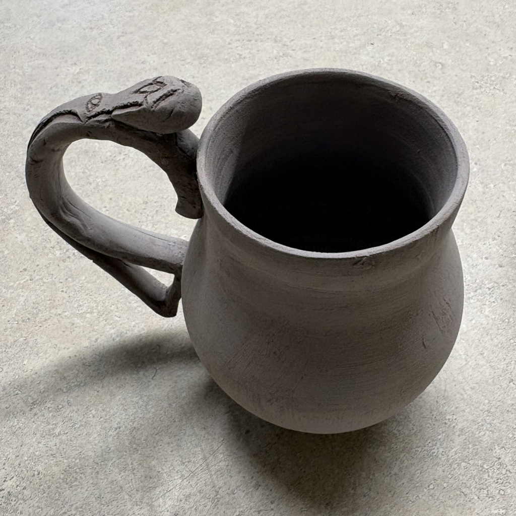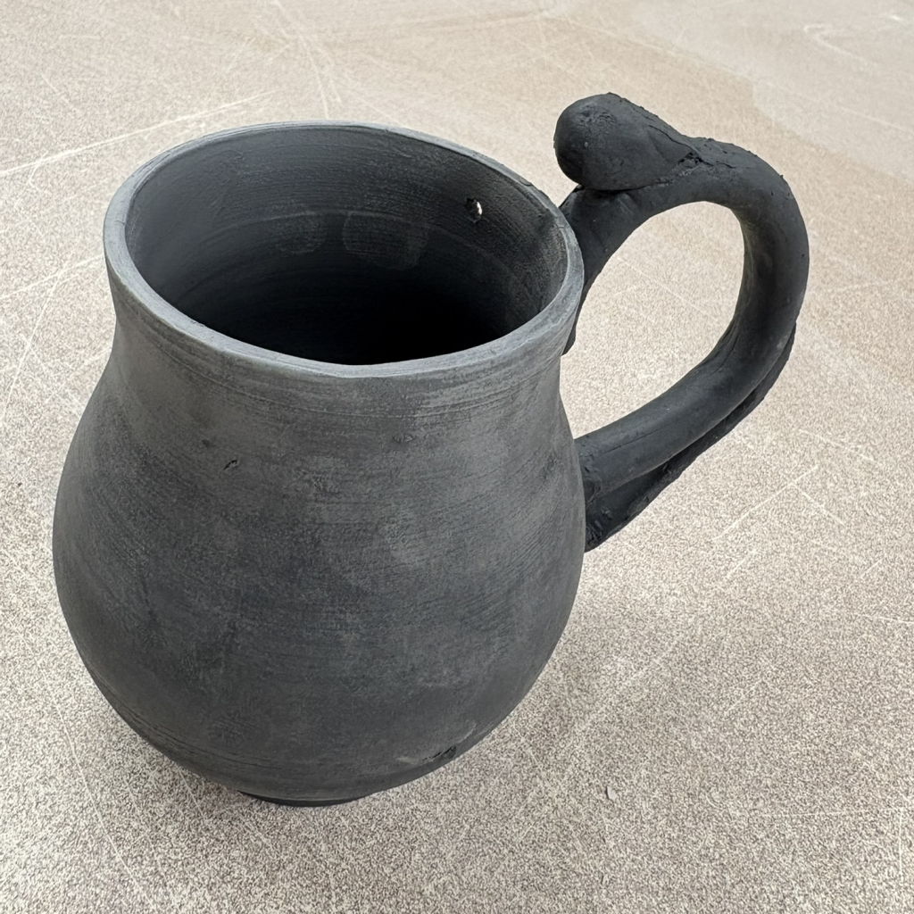 Tall mug with fancy handle and thumb rest. Glossy black inside, distressed gloss around the brim and on the handle. Lip piercing.