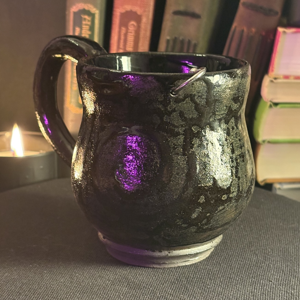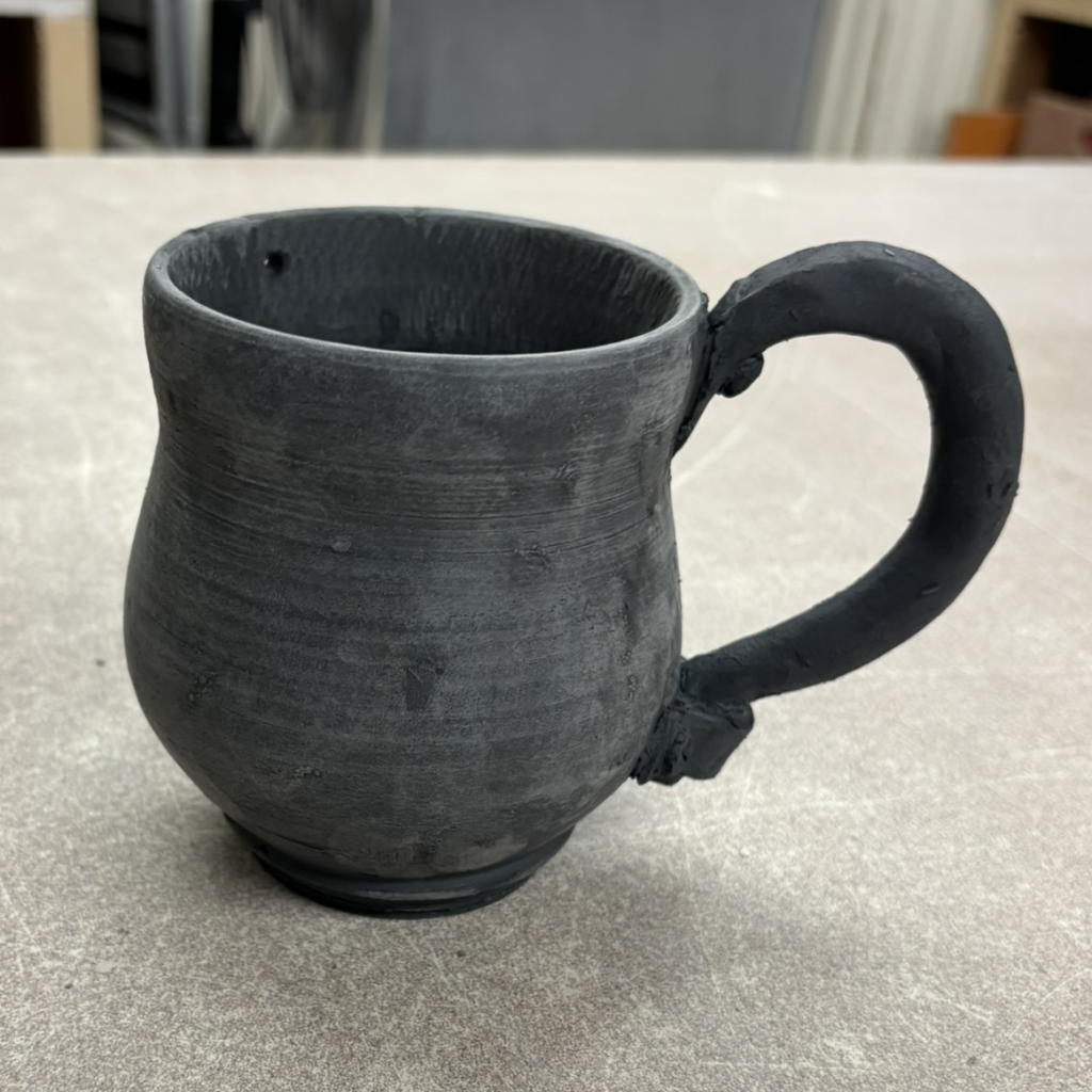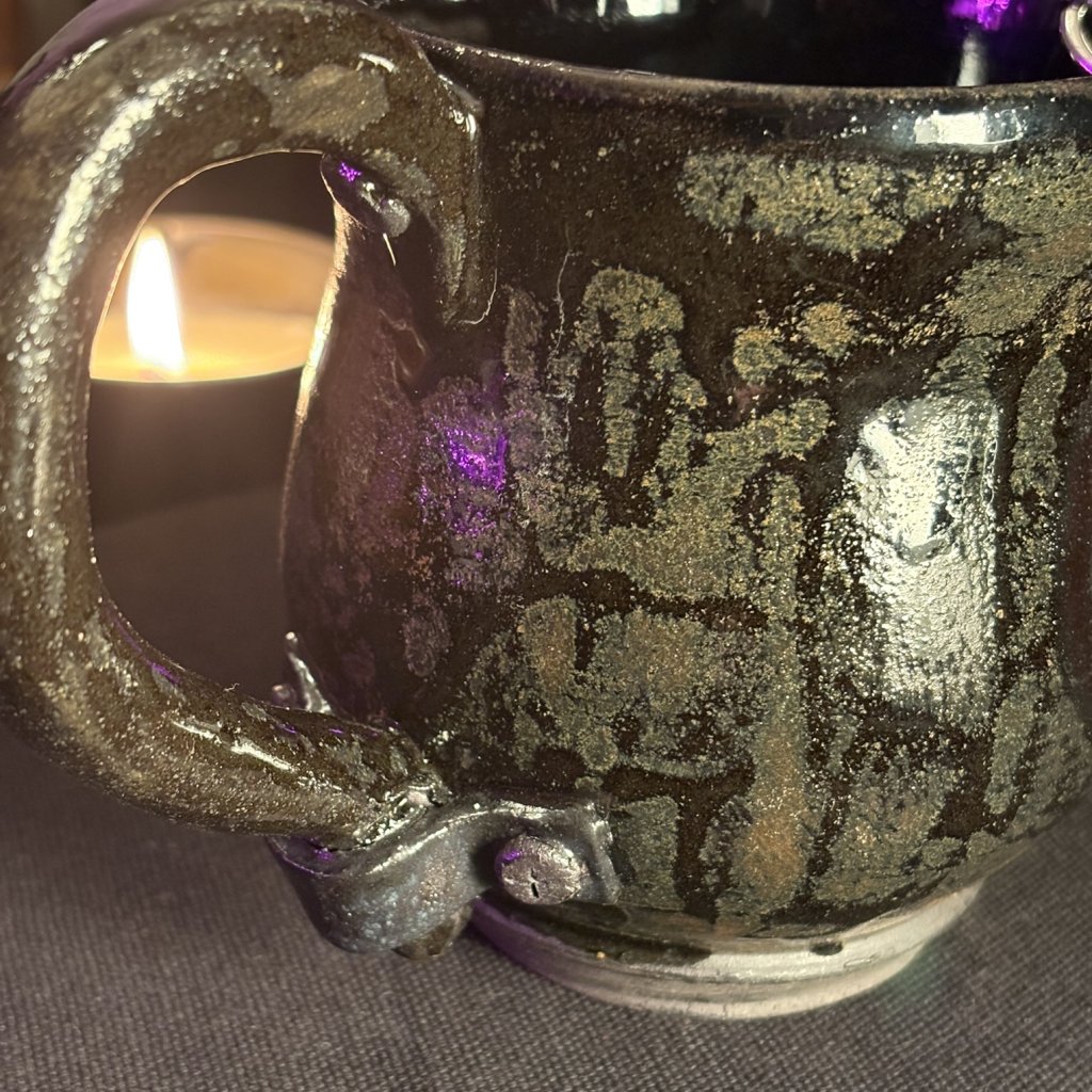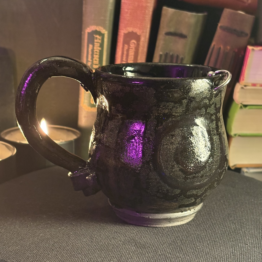 Tall mug with distressed finish outside, mottled with matte black and transparent gloss, obscuring a spiral design. Glossy black inside. Lip piercing.