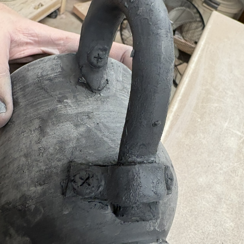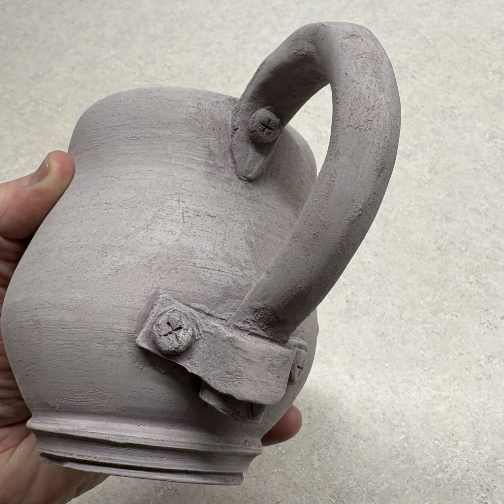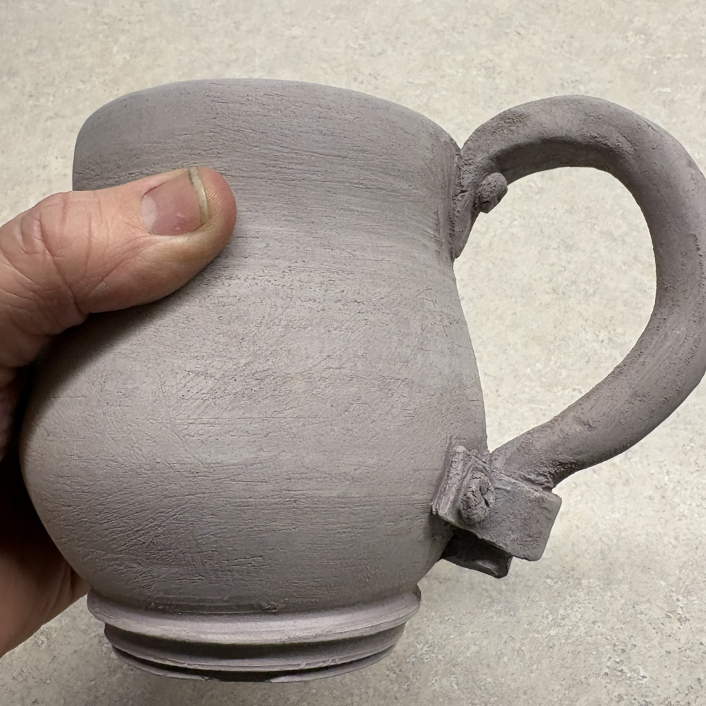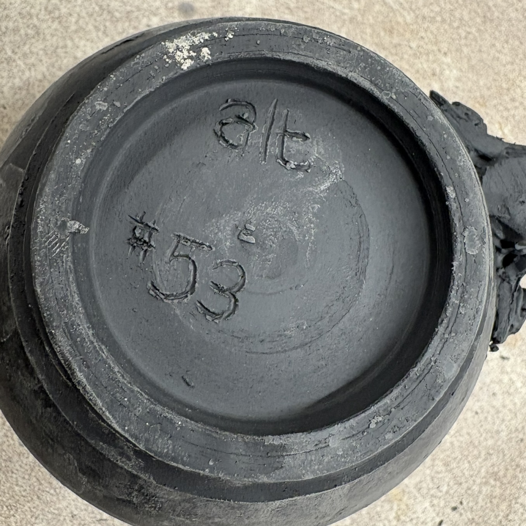 Tall mug with distressed finish outside, mottled with matte black and transparent gloss, obscuring a spiral design. Glossy black inside. Lip piercing.