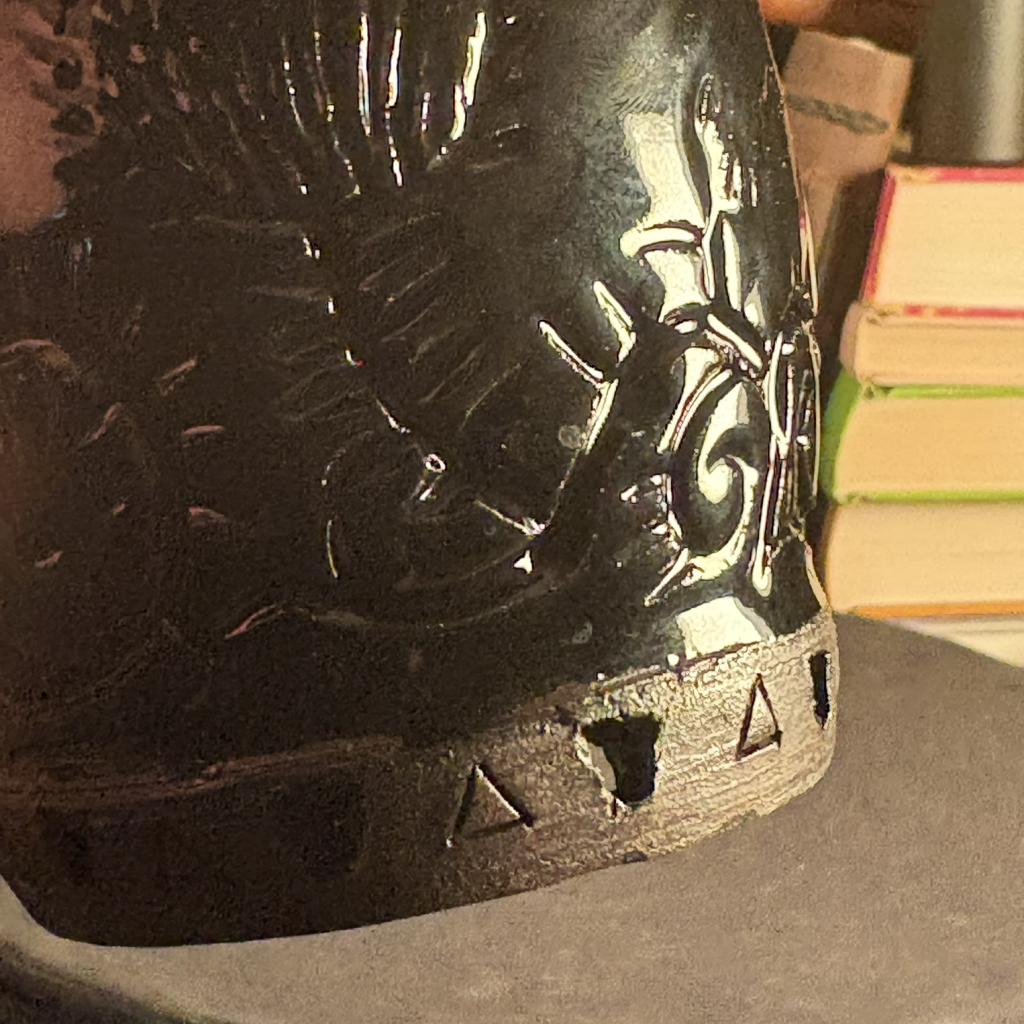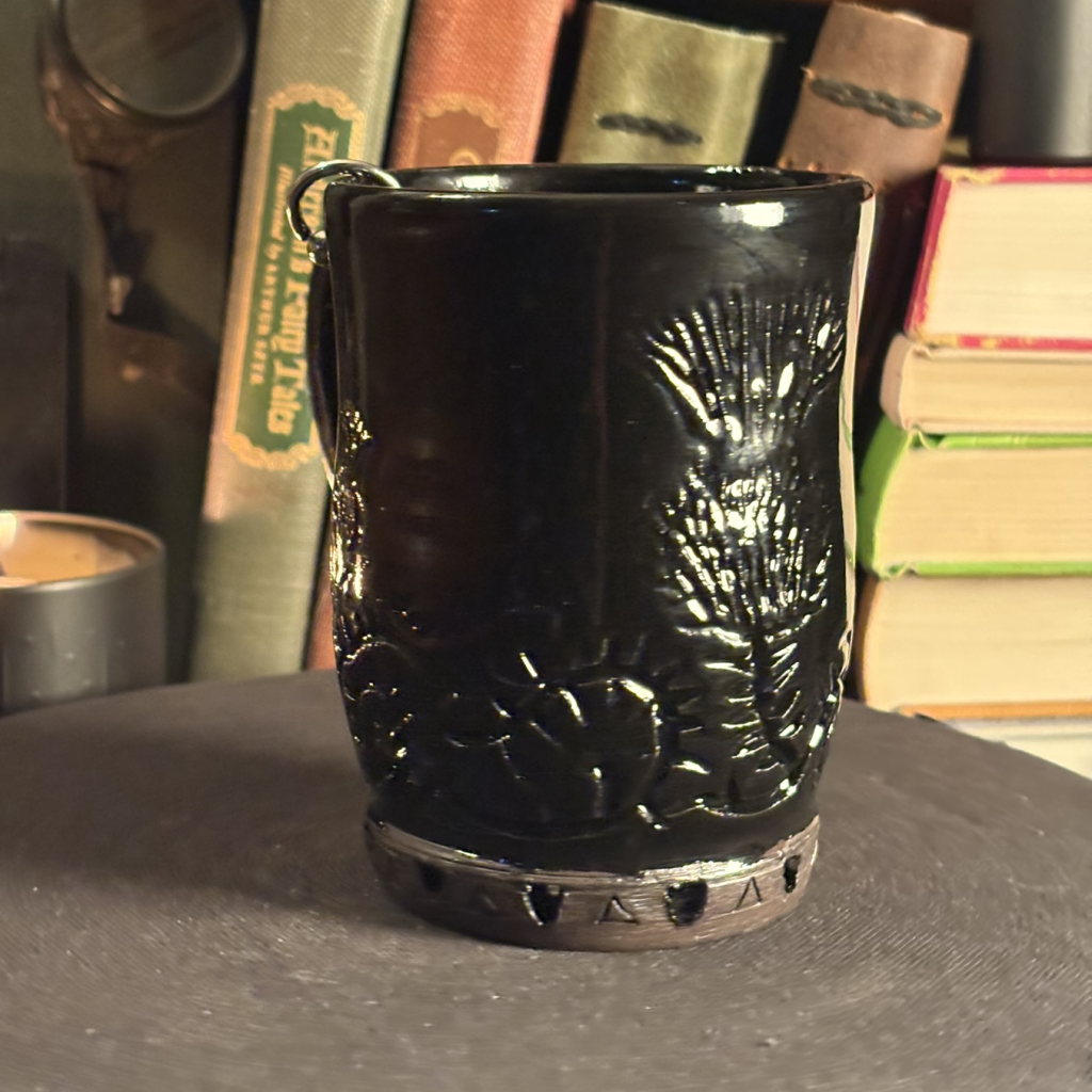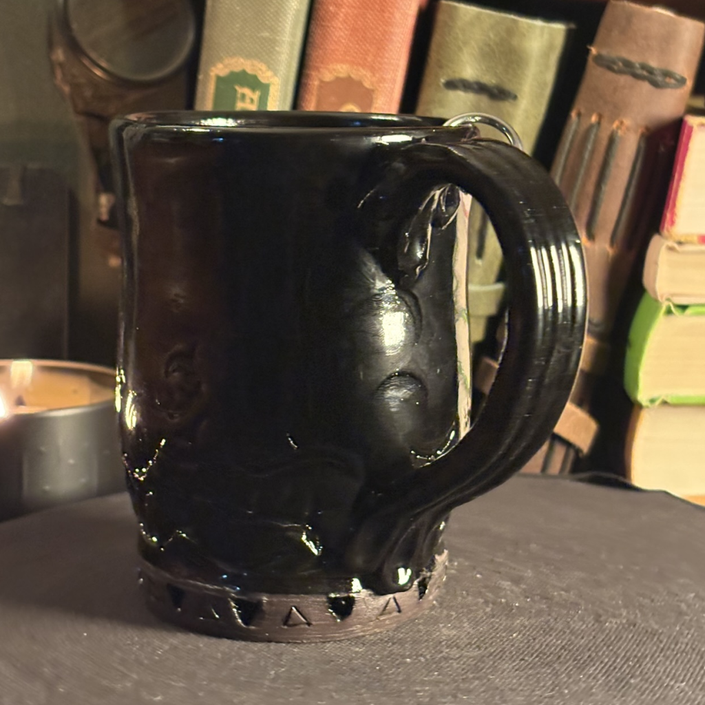 Glossy black glaze, made with iron oxide and cobalt carbonate. Food-safe, non-toxic. Recipe: https://glazy.org/recipes/3388